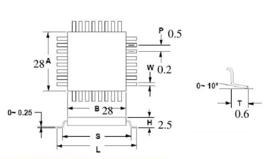 Typical wing component SQFP208 pad design: 0.4mm in front and 0.60mm behind the effective tin end of the component 0.25mm in width.