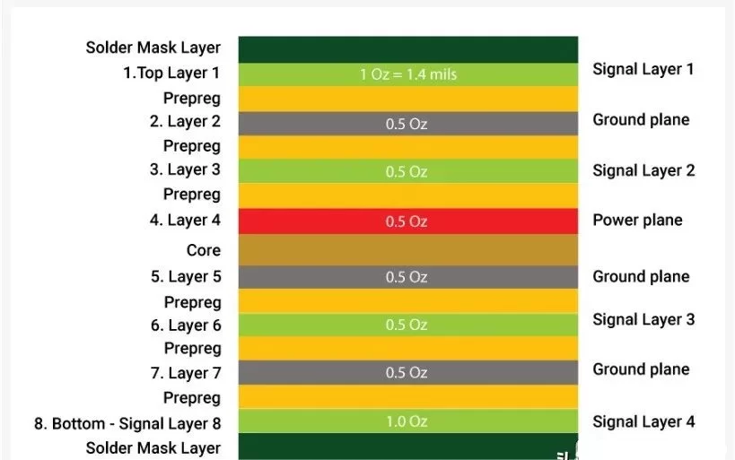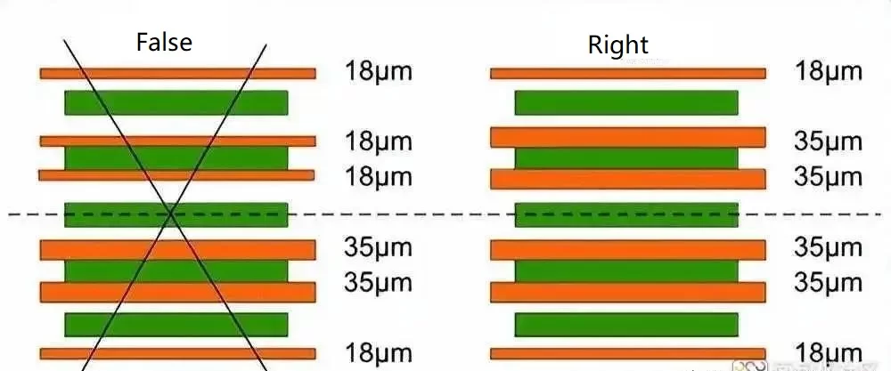 3. In the stack, the power planes should be placed symmetrically, and the weight of copper used in each power plane should be the same.